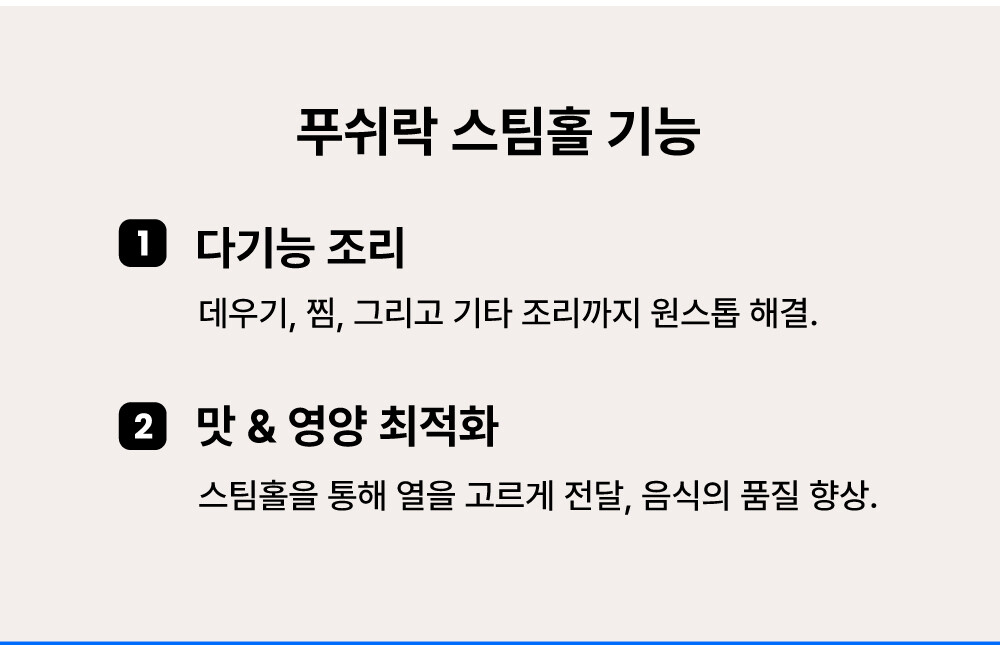 : 불균일하게 가열된 음식에 고민이셨다면, 내장된 스팀홀 기능이 재가열과 스팀 요리에서 문제를 제거해줍니다. 맛과 영양 가득하게 즐기세요.